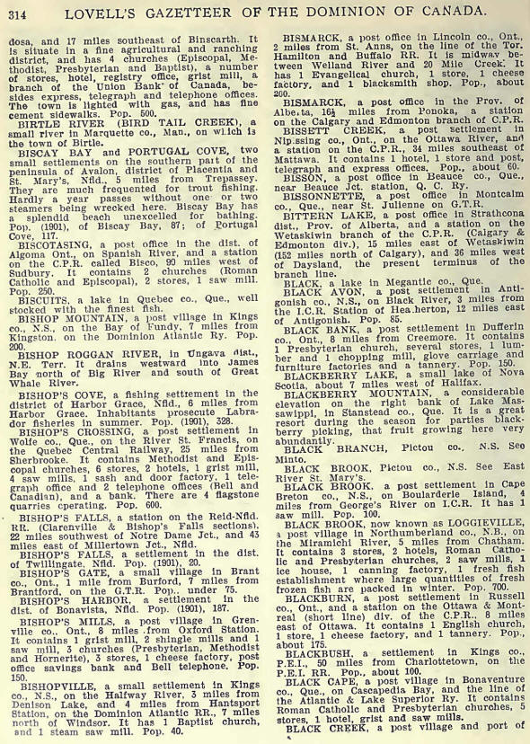 Bishop's Mills, Bishopville, Bismarck, Bissett Creek, Bisson,