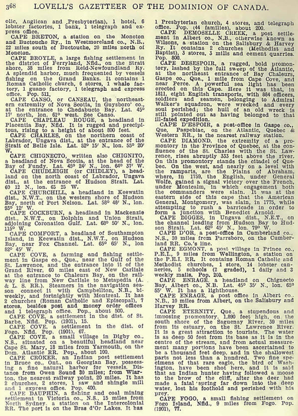 Cape Broyle, Cape Canso, Canseau, Cape Chapleau, Cape Charles, Cape