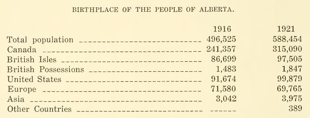 Fears have been expressed at various times by men of affairs and publicists that there is a danger of foreign immigration swamping the native born and destroying the distinctive character of Canadian laws and institutions. Up to the present time such fears are groundless. There is enough Anglo-Saxon blood in Alberta to dilute the foreign blood and complete the process of assimilation to the mutual advantage of both elements. The census of 1916 and the census of 1921 show in a general way the ethnological groups that are fusing to produce a rich and virile nationality in Alberta, as is true throughout the entire West.