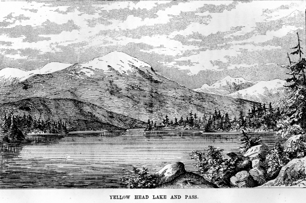 We had left the Myette flowing to the Arctic Ocean, and now came upon this, the source of the Fraser hurrying to the Pacific. At the summit, Moberly welcomed us into British Columbia, for we were at length out of "No man's land," and had entered the western province of our Dominion. Round the rivulet running west, the party gathered, and drank from its waters to the Queen and the Dominion. No incline could be more gentle than the trail from the Atlantic and Arctic to the Pacific slope. The road wound round wooded banks, a meadow with heavy marsh grass extending to the opposite hill. There had been little or no frost near the summit, and flowers were in bloom that we had seen a month ago farther east. The flora was of the same character on both sides of the summit; eight or nine kinds of wild berries, vetches, asters, wild honey-suckle, &c, &c. Good timber, the bark of which looked like hemlock, but that the men called pine, covered the ground for the next few miles to Yellow Head Lake. This beautiful sheet of water, clear and sparkling up to its firm pebbly beach, expanding and contracting as its shores recede or send out promontories, was absurdly called "Cowdung Lake" formerly, but ought always to bear the same name as the Pass. Towards the western end where we halted for dinner, its woods have been somewhat marred by fires that have swept the hill sides, but wherever these have kept off, its beauty is equal to, though of a different kind from Lake Jasper. Low wooded hills intersected with soft green and flowery glades rise in broken undulations from its shores. It is on those and up to the line of vegetation that a botanist should go; for there are few varieties along the low ground, but evidently many higher up. Above and behind the hills on the south side, towers a huge pinnacle of rock, the snow on whose summit is generally concealed by clouds or mist. On the north, the two mountains that we had seen yesterday, bounding the Pass on that side, and which had been hidden all the forenoon by the woods at their base, through which the trail runs, now looked out from right over our heads; riven masses of stratified rock, in a slightly curved line, forming a gigantic cross-cut saw. Through the Pass slate cropped out in several places, and boulders of granite strewed the ground, but the granite was not observed in situ. Probably, slate is what gold miners term "the bed rock," and Brown and Beaupré pointed out quartz veins that they had no doubt were gold bearing.